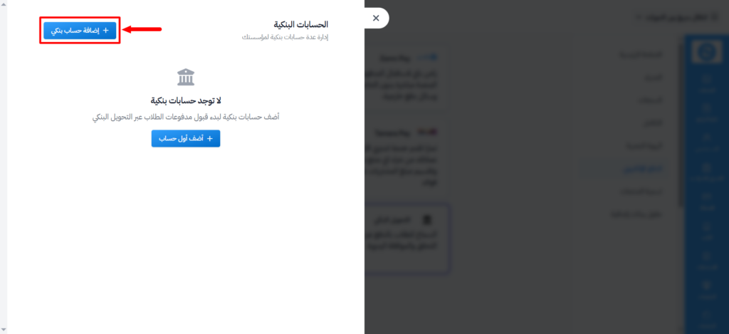 في حال عدم وجود أي حسابات بنكية مضافة مسبقًا في الأكاديمية، قم بالضغط على زر «أضف أول حساب» أو «إضافة حساب بنكي».