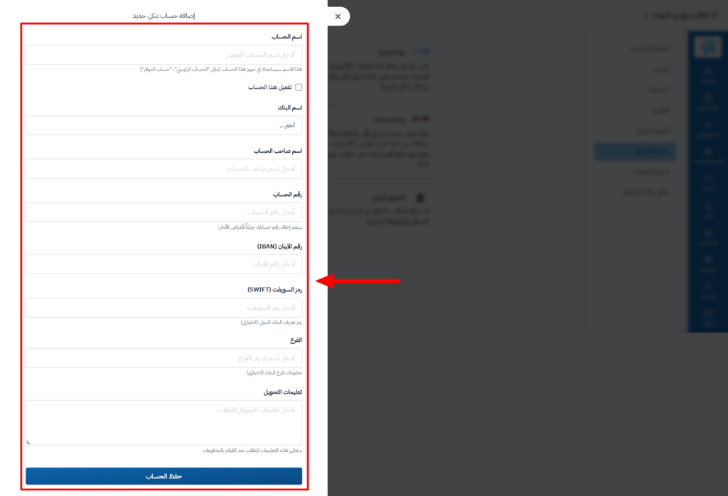 - رقم الآيبان (IBAN): أدخل رقم الآيبان الخاص بالحساب.