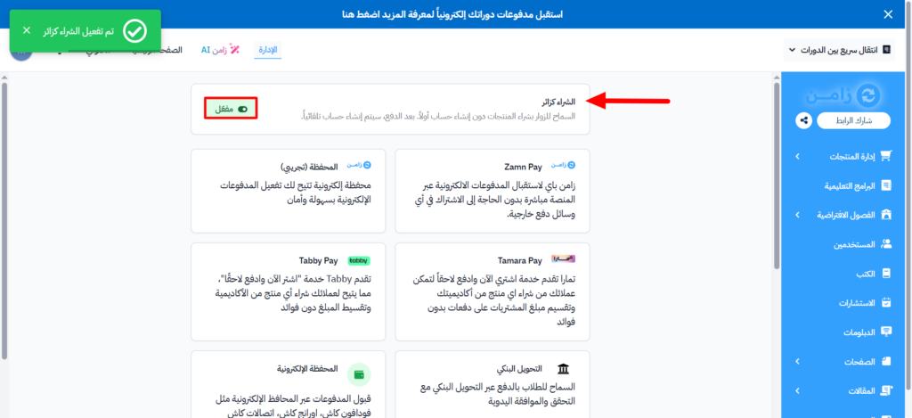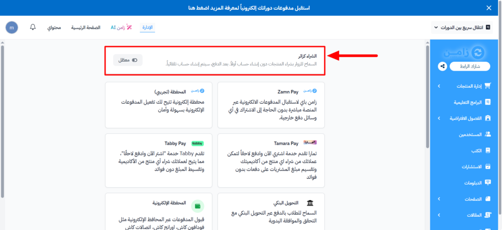 تنويه : يجب تفعيل بوابة الدفع الإلكترونية Zamn Pay قبل إتاحة خيار الشراء كزائر.