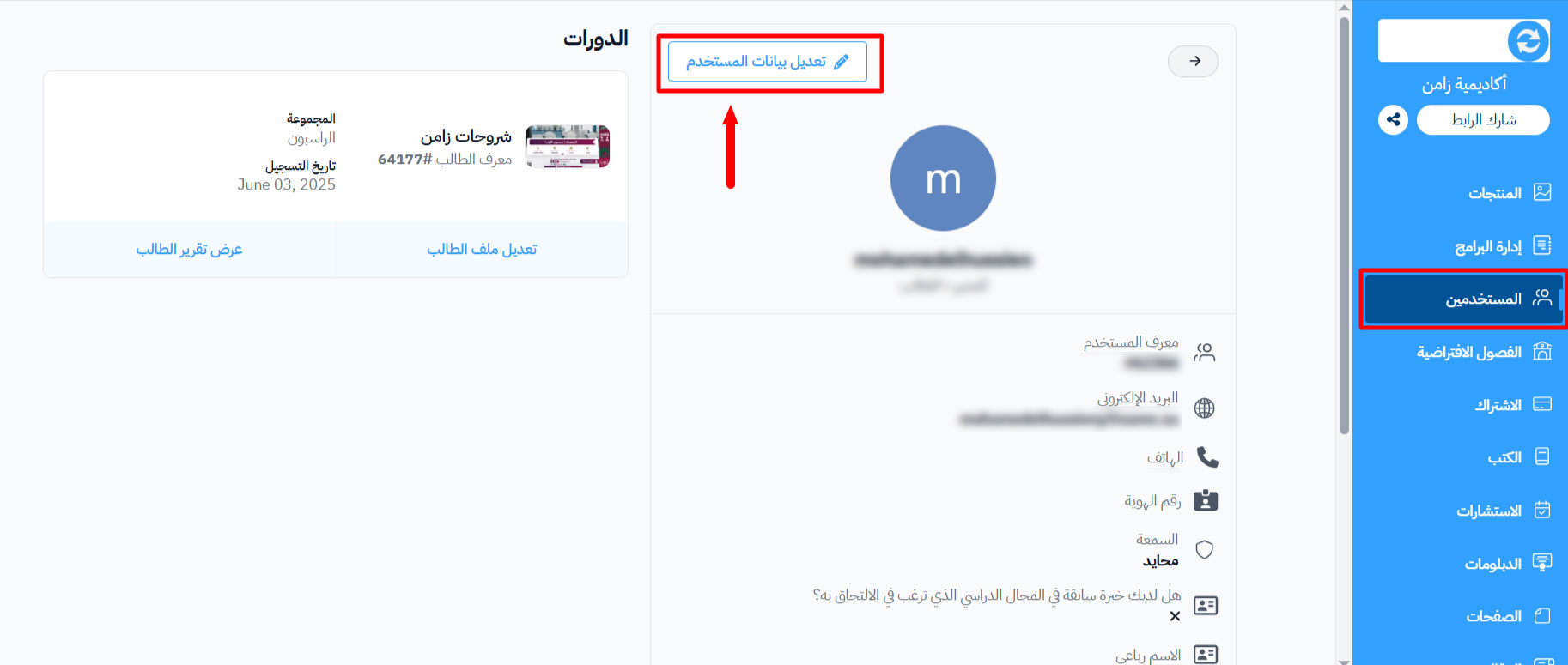 3. في صفحة بيانات المستخدم، اضغط على زر “تعديل بيانات المستخدم”.