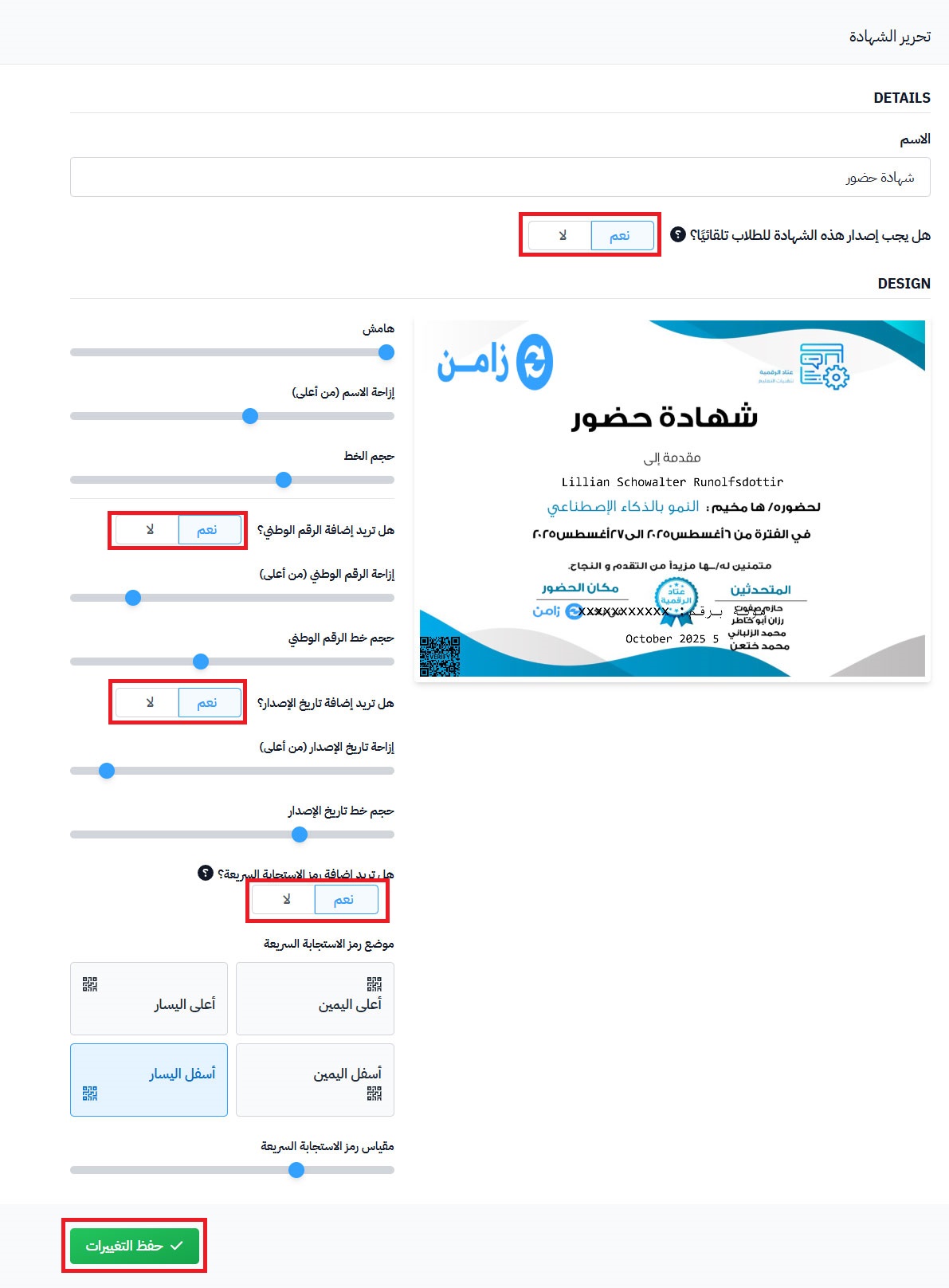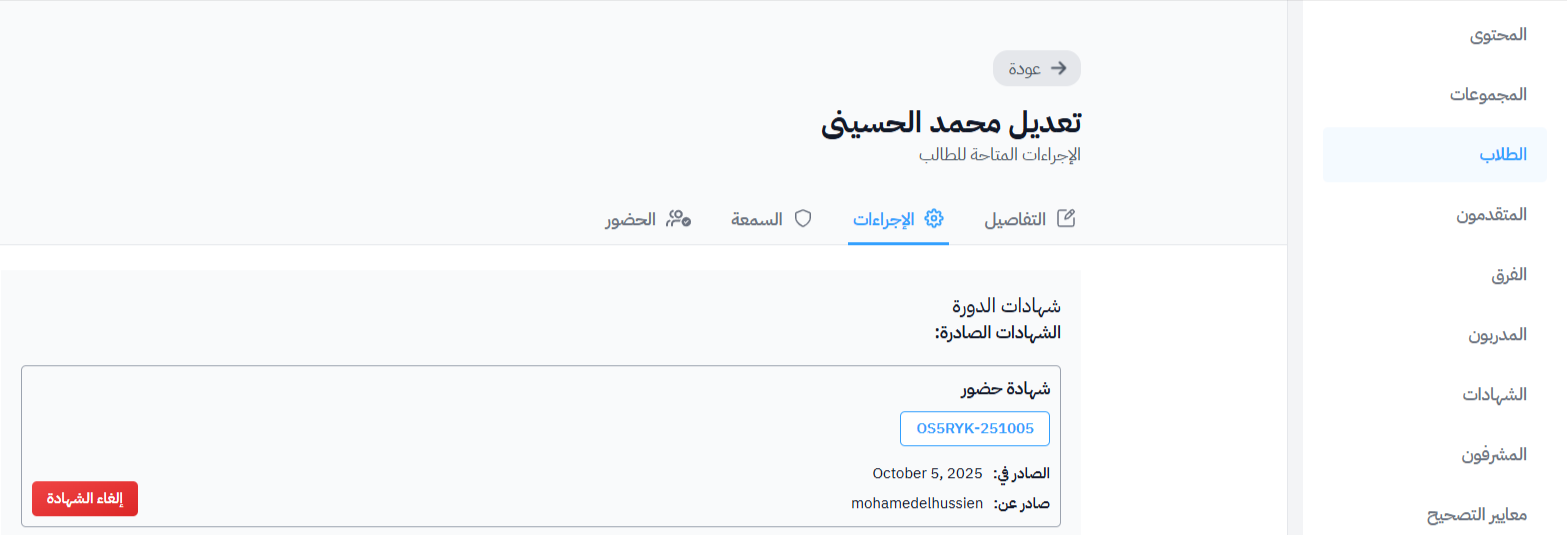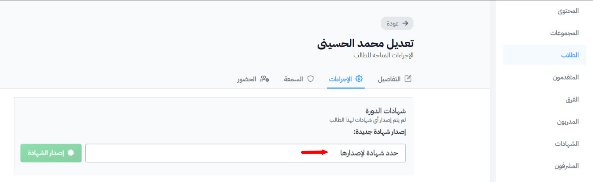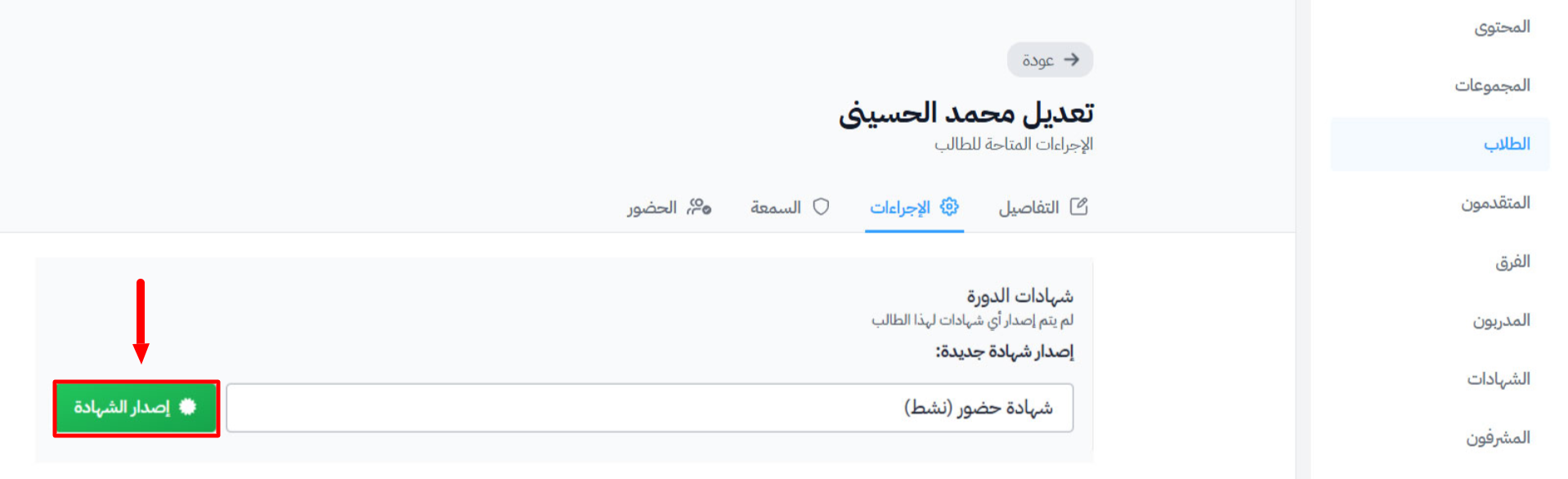 إذا قمت بتفعيل إصدار الشهادة بشكل تلقائي، سيتم إصدارها عندما يكمل الطالب الدورة.
