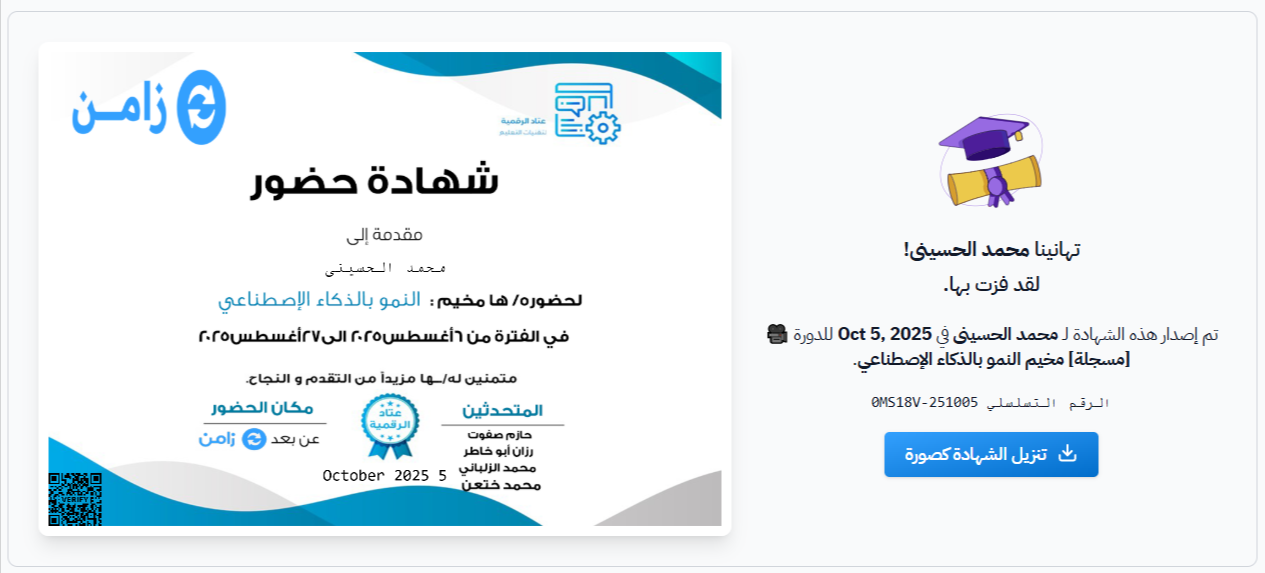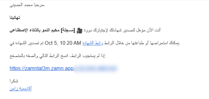 سيتم إرسال الشهادة برسالة إلى بريد المتدرب.