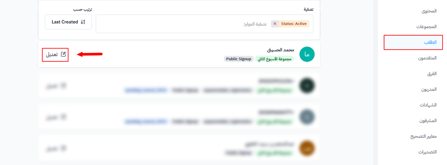 - اختر الطالب الذي تريد إرسال الشهادة له، و اضغط على ” تعديل”.
