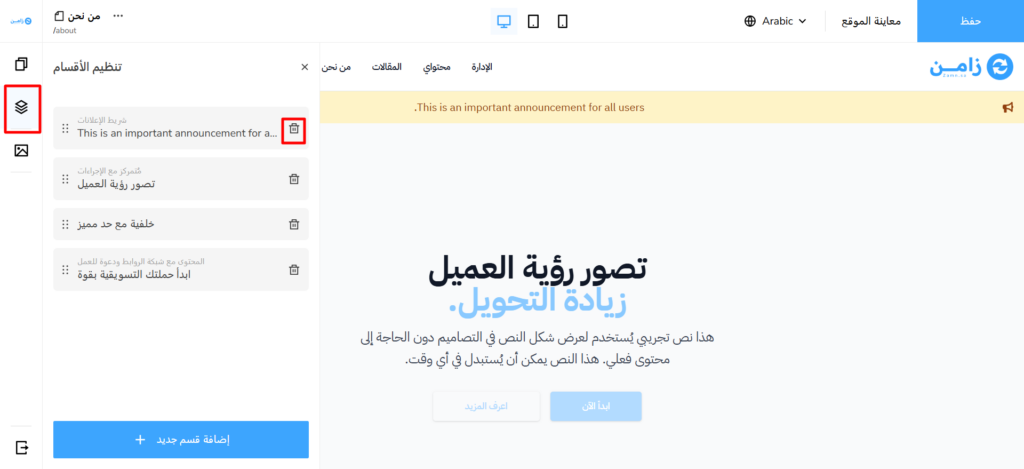 • إعادة ترتيب الأقسام (سحب وإفلات).