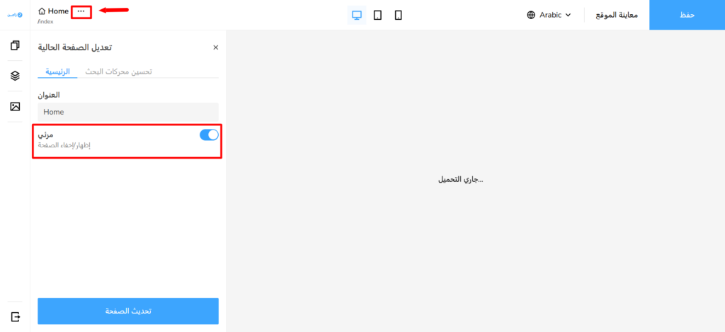 تصبح الصفحة الرئيسية الافتراضية في باني الصفحات(Home) هي الصفحة الرئيسية للمنصة عند تفعيل خيار الظهور