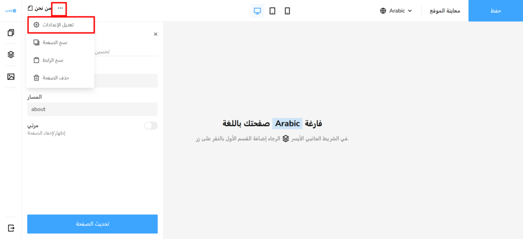 يتم التحكم في إعدادات الصفحة عبر قائمة النقاط الثلاث، كما هو موضح في الصورة عند الرقم (1).