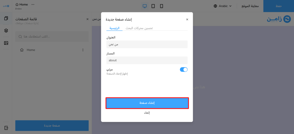 • اضغط على «إنشاء صفحة» لإتمام العملية.