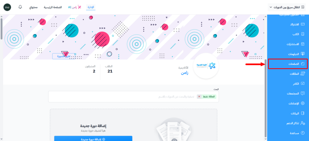 1. من لوحة التحكم في الأكاديمية، انتقل إلى قسم الصفحات.