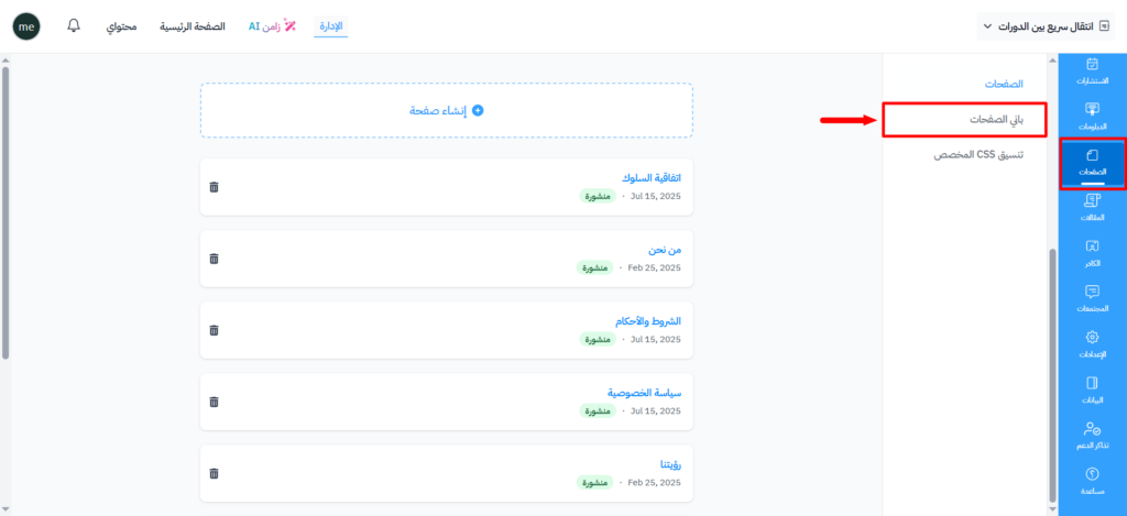 “باني الصفحات” هي أداة مرئية متقدمة، متوفرة حصريًا لمالك الأكاديمية، تتيح لك إنشاء صفحات داخل منصتك التعليمية بسهولة تامة ودون الحاجة لأي خبرة تقنية. سواء كنت ترغب في إنشاء صفحة هبوط، صفحة تعريفية، أو أي نوع من الصفحات الأخرى، توفر لك هذه الأداة كل ما تحتاجه لتصميم صفحات جذابة وفعّالة.