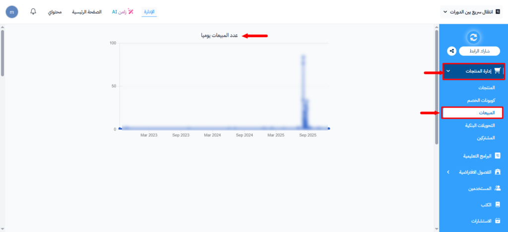 • رسم بياني يوضح عدد المبيعات اليومية، مما يساعدك على معرفة أيام الذروة في نشاطك ومتابعة أداء المبيعات بشكل مرئي وواضح.