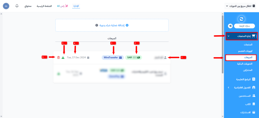 6. أيقونة حذف المشتري (في حال كان المشتري مضافًا يدويًا)