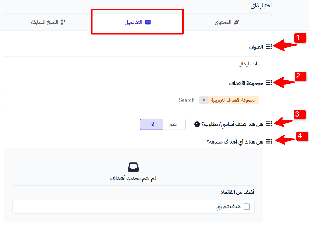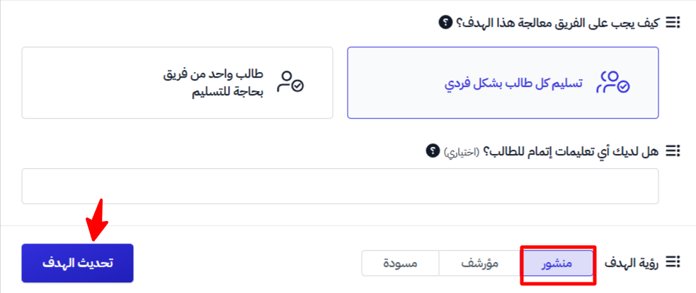 من صفحة “المحتوى” للدورة يجب إنشاء هدف جديد أو التعديل على هدف منشئ سابقا.