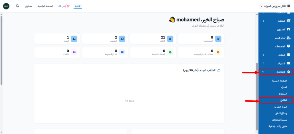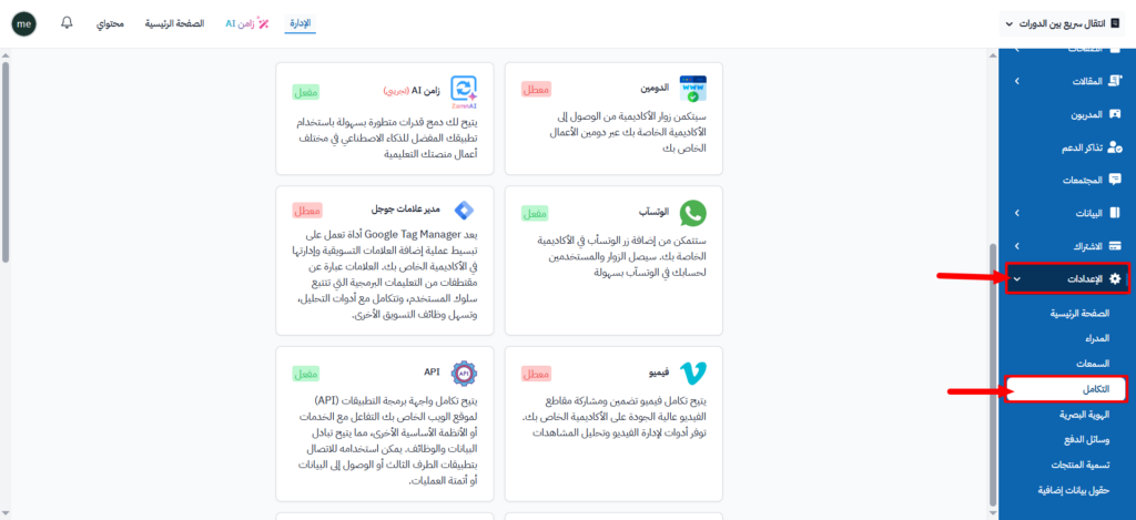 2 . من القائمة الجانبية، انتقل إلى الإعدادات واختر التكامل