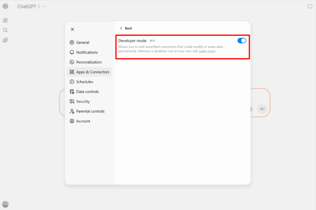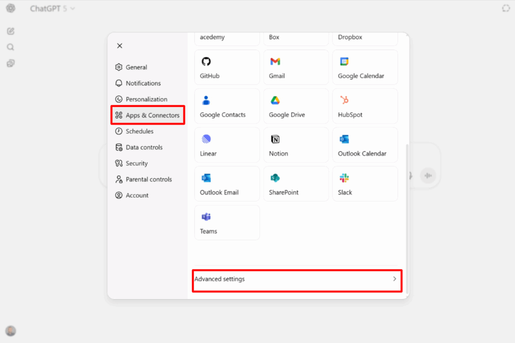 - من واجهة ChatGPT، انتقل إلى: Settings → Apps & Connectors → Advanced settings