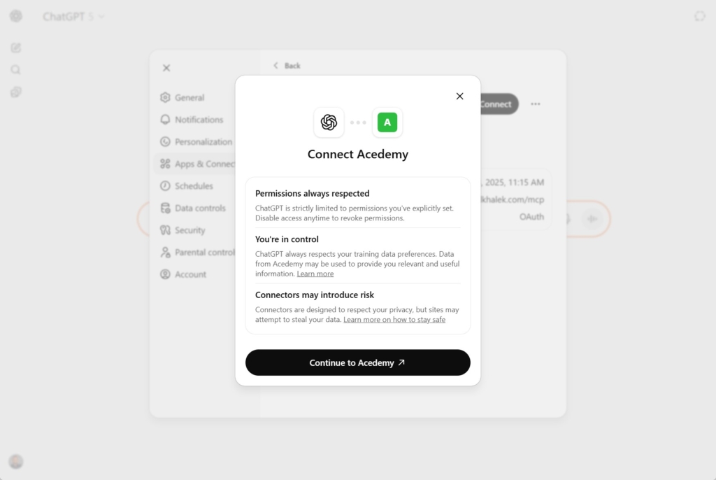 - تأكد من أنك قد قمت بفتح أكاديميتك وسجلت الدخول باستخدام حساب مدير الأكاديمية داخل نفس المتصفح الذي تستخدمه في ChatGPT، حتى يتم الربط بنجاح دون حدوث أي تعارض في الجلسة.