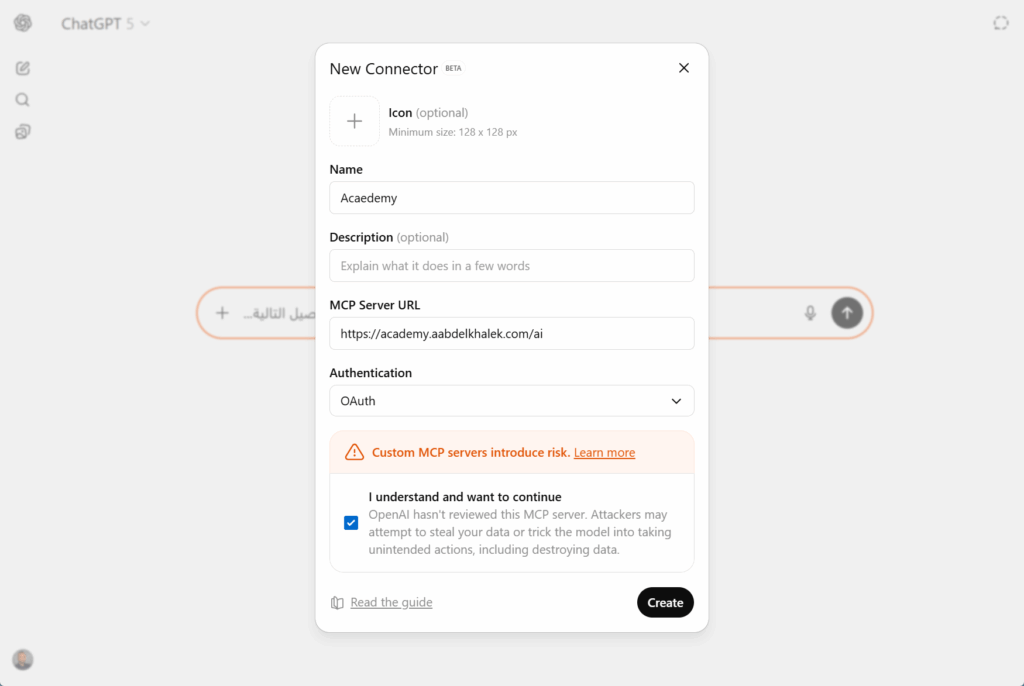 - Description (اختياري): أضف وصفًا مختصرًا يوضح وظيفة الـ Connector، حيث يُستخدم هذا الوصف من قبل النظام لتحديد نوع الأداة.