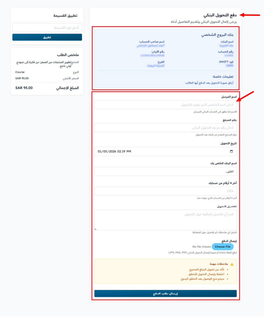 - إيصال الدفع: قم برفع صورة واضحة لإيصال التحويل البنكي.