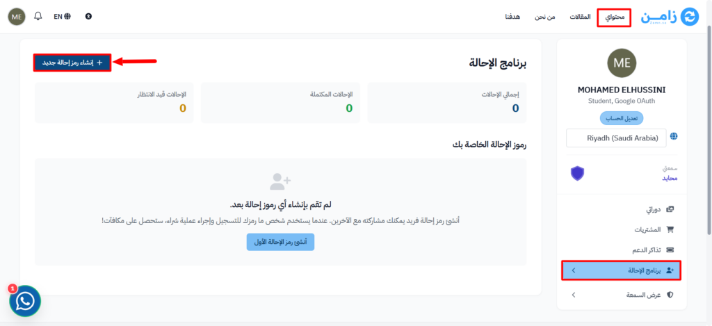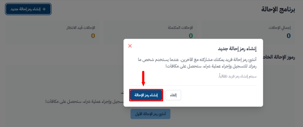 5 . في نافذة المنبثقة البوب آب (popup)، اضغط على زر إنشاء رمز الإحالة لتأكيد العملية.