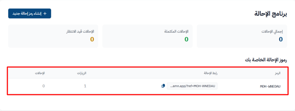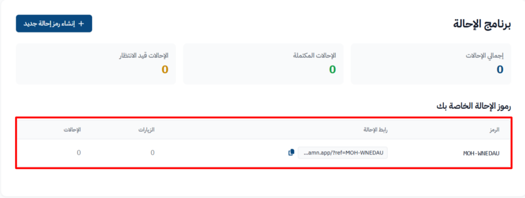 6 . بعد الإنشاء، سيظهر لك كود إحالة فريد ورابط مخصص يمكنك استخدامهما في حملاتك التسويقية لمتابعة المبيعات والزيارات.